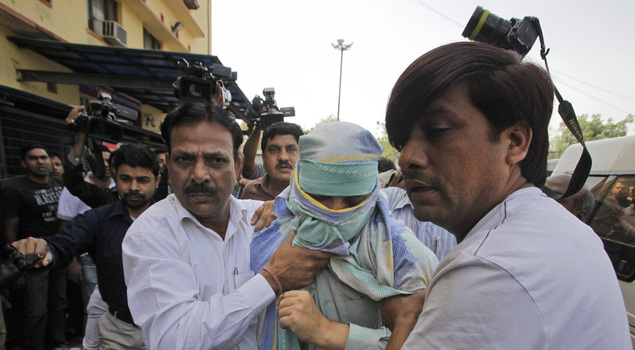Policemen wearing plain clothes escort Syed Mohammed Kazmi, center, a suspect in last month's bombing of an Israeli diplomatic vehicle, from a local court, in New Delhi, India, Wednesday, March 7, 2012.