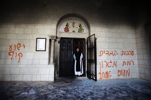 A Trappist monk stands between graffiti reading in Hebrew, "Jesus is a monkey" (L) and "mutual guarantee, Ramat Migron and Maoz Ester" |